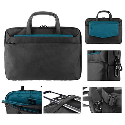 Borsa porta notebook in nylon per MacBook Pro o laptop 13 con element i a colori a contrasto del vano interno e della tasca, questultima utilizzabile in tre modi diversi: totalmente nascosta, parzialmente visibile o estratta completamente, per una estensione di capienza. In dotazione tracolla removibile e vano interno Anti-shock System per la protezione del device.
