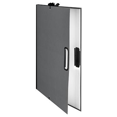 Cartella rivestita con carta goffrata accoppiata su cartone ad alto spessore e rilegata in tela con maniglia in plastica e lacchi di chiusura.