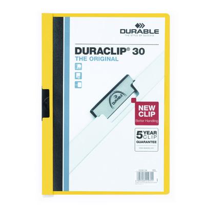 Cartellina in PVC con fondo colorato e frontale trasparente, con molla in acciaio sul dorso. Due diverse capacità: da 1 a 30 fogli A4 e da 1 a 60 fogli A4.