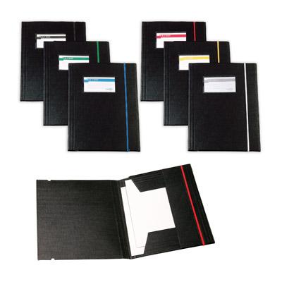 Cartellette in Colpan nero (cartone rivestito in PVC) chiusura a tre lembi con elastico colorato. Dotate di porta cartellino con etichetta colorata. Possono contenere qualsiasi tipo di documento fino ad un massimo di 3 cm.