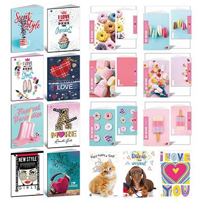 Maxi quaderni con risguardo, disponibili in due diverse grammature e fogliazioni, copertine fantasie assortite.