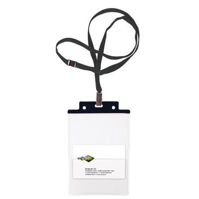 Porta nome in PVC rigido trasparente di altissimo spessore con rinforzo colorato. Dotato di cordoncino di raso colorato da 10 mm. con pinzetta metallica e chiusura antisoffocamento. Adatto a congressi meetings, eventi sportivi e altro.
