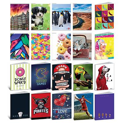 Quaderni in carta da gr. 80, disponibili con copertine in temi assortiti e in 7 diverse rigature.