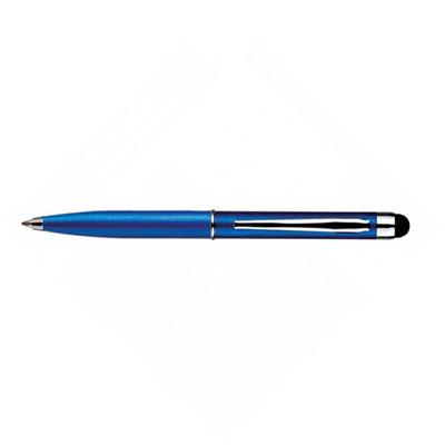 Penna a sfera della lunghezza di cm.10 con meccanismo a rotazione per l'uscita della punta, utilizza mini refill, interamente in metallo con gommino nella parte superiore per l'utilizzo sui touch screen di tablet o smartphone.