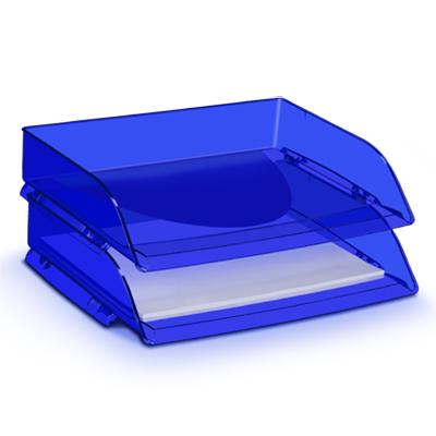 Vaschette portacorrispondenza trasparenti con apertura sul lato lungo,per un più facile e comodo accesso ai documenti,in colori moderni e brillanti, impilabili verticalmente anche in posizione scalare,realizzate in polistirene antiurto riciclabile,coordinabili con gli altri accessori della linea HAPPY.