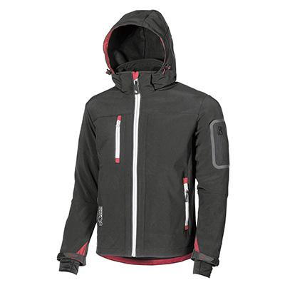 Giacca in tessuto Soft Shell stretch traspirante antivento e idrorepellente. Tasca portacellulare su petto con chiusura zip; tasca supplementare su manica termosaldata; cappuccio staccabile con zip, maniche preformate per vestibilit ottimale; c oulisse antimpigliamento regolabile dall'interno tasca; polsini regolabili con velcro e polsino antivento elasticizzato con buco per pollice; fondo sagomato. Composizione: 96% poliestere; 4% elastane; menbrana TPU; 310 gr/m. Colore nero, taglia XL.