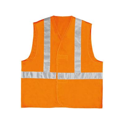 Gilet ad alta visibilit classe 2 c olore arancione con bande a bretella color argento retro-riflettenti cucite. Chiusura mediante fascia auto-stringente. Taglia L. Ideale per ambienti di lavoro in Edilizia.