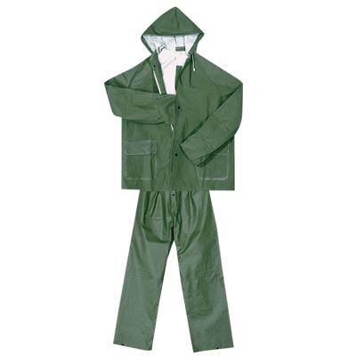Completo giacca e pantaloni in tessuto impermeabile cucito e saldato, bispalmato in PVC/Poliestere/PVC. Spessore mm.0,30. Cappuccio fisso con cordino, chiusura con cerniera coperta, bottoni in PVC a pressione, mantellina sulla schiena con fori di aerazione, fori di ventilazione sotto le ascelle, polsino stringi-polso con elastico interno alle maniche, 2 tasche sulla parte anteriore, pantaloni con elastico in vita. Colore verde. Taglia XL.