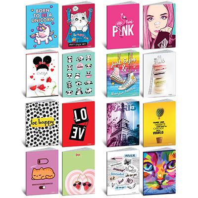 Maxi quaderni con risguardo, disponibili in due diverse grammature e fogliazioni, copertine fantasie assortite.