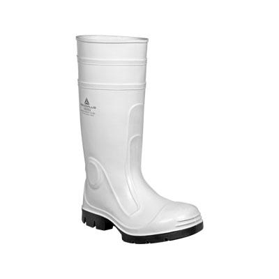 Stivali di sicurezza per un impiego generale per utilizzi su suolo di tipi industriali lisce e grasso o suolo mobile, per impieghi interni o esterni con rischi scosse equivalente a 200 Joule e contro lo schiacciamento fino a 1500 daN. Tomaia in PVC doppia iniezione senza cadmio n piombo e resistente alla penetraz ione dell'acqua. Fodera : Jersey poliestere. Suola antiscivolo con designo autopulente in nitrile + PVC per resistere agli agenti aggressivi. Protezione rinforzata della tibia, del malleolo e del tallone. Puntale resistente agli urti e allo schiacciamento. Tallone assorbitore di energia. Suola resistente agli idrocarburi e con rilievi resistente allo scivolamento. Protezione antistatica. Colore bianco, taglia 40. Ideale per ambienti di lavoro in Edilizia, Artigianato/Bricolage, Agricoltura, Alimentare/Igiene.