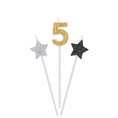 Candeline picks composte da 2 candele a forma di stella e una con il numero; cm 16, numero 3