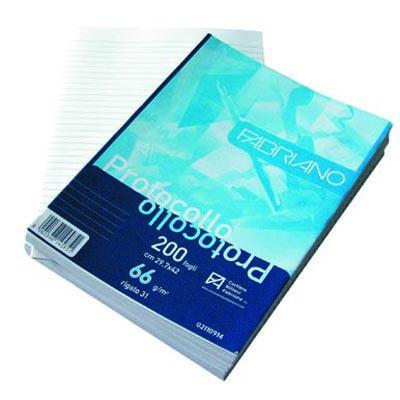 Fogli protocollo in carta non filigranata, prodotta con cellulosa di prima qualità distribuita in varie rigature. I protocolli vengono forniti in formato chiuso A4 da gr. 66. Confezione da 200 fogli.