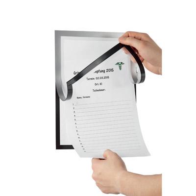 Cornice adesiva rimovibile con pannello frontale a chiusura magnetica e portapenne. Il pannello è dotato di una finestra per poter scrivere direttamente sull'inserto.La soluzione ideale per esporre avvisi,elenchi,programmi che vanno compilati. Colore nero.