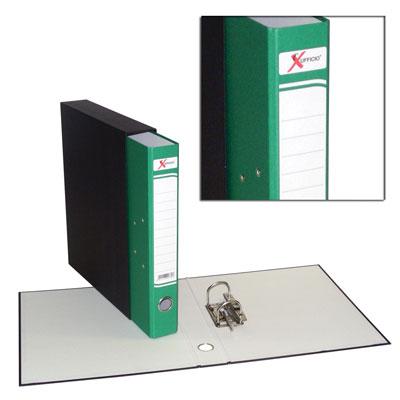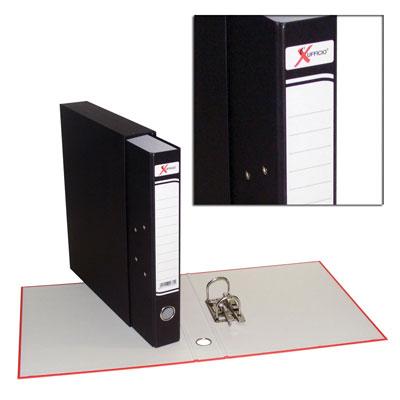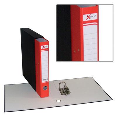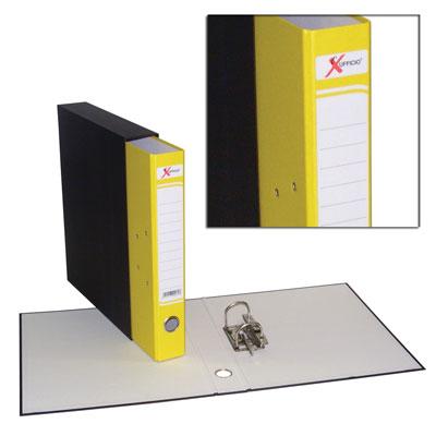 Registratore in cartone accoppiato di prima qualità rivestito con carta goffrata, completo di etichetta stampata e custodia rivestita in carta nera liscia, è dotato di meccanismo a leva in metallo a due anelli passo 8 completo di pressino, occhiello rinforzato in metallo sul dorso per facilitare l'estrazione, rivetti nichelati. Disponibile in diversi colori e nelle nuovissime tonalità fluo.