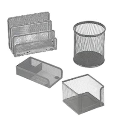 Set scrivania in rete metallica traforata da 4 pezzi composto da: portapenne, portaoggetti, sparticarte, portanotes. Colore: nero.