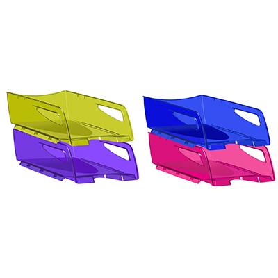 Vaschette portacorrispondenza ad alta capacità in colori moderni e brillanti,impilabili verticalmente anche in posizione scalare,con taglio a "U" per un comodo accesso ai documenti e piedini antiscivolo,le due maniglie laterali consentono un comodo trasporto,realizzate in polistirene riciclabile antiurto,coordinabili con gli altri accessori della linea HAPPY